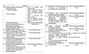 जनरल कॅटगरीतील विद्यार्थ्यांना द्वितीय श्रेणी आणि स्लीपर क्लासमध्ये 50 टक्के सवलत दिली जाते आणि MST (मासिक हंगामी तिकीट) आणि QST (त्रिमासिक हंगामी तिकीट) मध्ये 50 टक्के सवलत दिली जाते. SC/ST श्रेणीतील विद्यार्थ्यांना द्वितीय आणि स्लीपर वर्गात 75 टक्के सवलत आणि MST आणि QST मध्ये 75 टक्के सवलत मिळते.