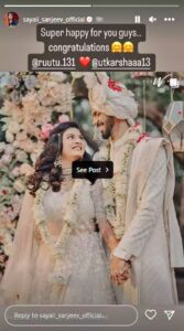 सायलीने ऋतुराज आणि उत्कर्षा यांना लग्नाच्या शुभेच्छा दिल्या आहेत. सायली म्हणाली, ”तुमच्यासाठी खूपच आनंदी आहे, अभिनंदन ऋतुराज आणि उत्कर्षा’. तिने यासोबत हार्ट इमोजी पोस्ट करत त्या दोघांना या इन्स्टाग्राम स्टोरीमध्ये टॅगही केले आहे.